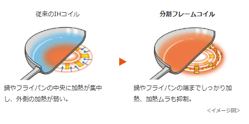 分割フレームコイルで鍋の端までムラを抑えて均一に加熱!