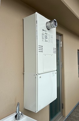 草津市分譲マンションにて、ベランダ壁掛けタイプの給湯器を交換。