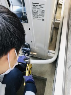 ヒートポンプの往き戻り配管を接続しています。水漏れ、お湯もれしないように、配管を継手の奥までしっかり挿入します。