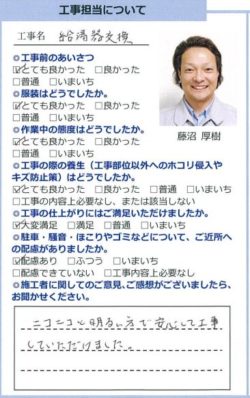見積りの段階から丁寧でわかりやすい説明で安心して工事をお願いできました。施工事もひとつひとつ説明して下さって安心でした。また草津の工事でもお世話になります。