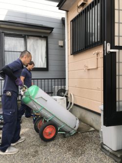 同時に、今まで長年ご愛用いただいたガスボンベを撤去していきます。ガスでのお付き合いはなくなるので少し寂しいですが、家のことはなんでもクサネンにご相談くださればうれしいです。