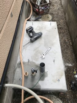 まずは、エコキュートを設置する場所にコンクリートのベースを作成する必要がありますので、既設の給湯器を一旦取り外して、給水や給湯、排水の配管をベース内におさまるように配管の仕込みを行います。