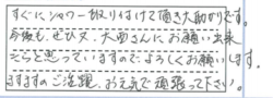 すぐにシャワー取り付けていただき大助かりです。今後も、ぜひ又大西さんにお願い出来たらと思っていますのでよろしくお願いします。ますますのご活躍、お元気で頑張ってください。