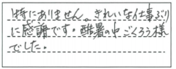お約束の時間通りに総ての作業を完璧にやり終えて頂きました。家の照明が不調で少し暗い中とどこおりなくして頂き申し訳なかったです。ありがとうございました。