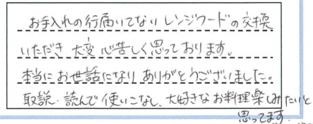 お手入れの行届いていないレンジフードの交換いただき大変心苦しく思っております。
