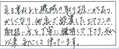 年を重ねると機械の取り扱いがむつかしくなり、他店で設置したエアコンの取り扱い方を丁寧に説明してくださり、それ以来安心して使っています。