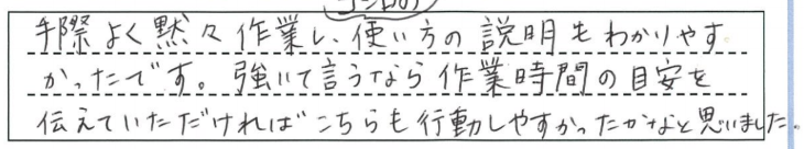 手際よく黙々作業し、コンロの使い方の説明もわかりやすかったです。強いて言うなら作業時間の目安を伝えていただければこちらも行動しやすかったかなと思いました。
