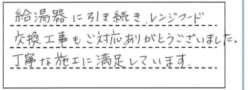 給湯器に引き続き、レンジフード交換工事もご対応ありがとうございました。