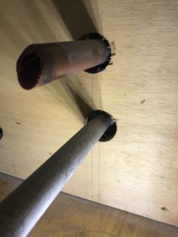 後ろの壁から、電線、排水管、給水管が出てきていますが、次は下部収納を取り付けるため、給水管が干渉してしまうため、一部配管をやりかえます。