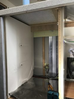 旧レンジフードを撤去したところ、背面を固定する部分にパイプがあり取り付け位置があわないため、コンパネ(合板)を貼らせていただきました。