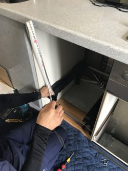 別件で卓上型食器洗い乾燥機からビルトインタイプへの交換ができないかとのご相談も受けました。シンク下を見せていただき、サイズ・排水など、ビルトインタイプの設置が可能であることが確認できました。