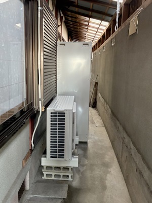 外観の違いは、エコキュートには大気熱を取り込むためのヒートポンプの設置が必要になります。(写真奥、エアコンの室外機のような機器です)
