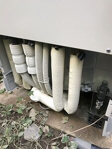 写真の灰色の配管は貯湯タンクからの排水配管の様子です。ヒートポンプからの排水は少し離れた樋に流れるようにしています。