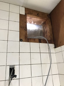撤去するとタイルが貼られて部分があり、このままスリム型レンジフードを設置すると下地が露出する部分ができます。