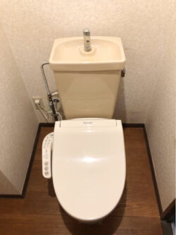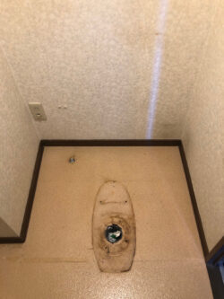 こちらは交換前のトイレ、トイレ本体は経年32年程度でした。床材はクッションフロアの上に簡易的なフローリングが貼られていました。