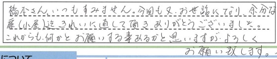 橋本さんいつもすみません。今回も又、お世話になり余分な扉(小屋)迄きれいに直して頂きありがとうございました。これからも何かとお願いする事あるかと思いますが、よろしくお願い致します。