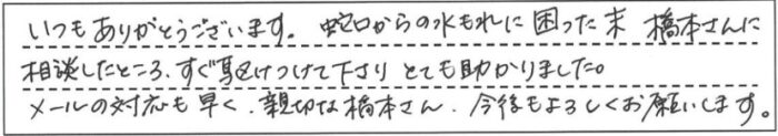 いつもありがとうございます。蛇口からの水もれに困った末、橋本さんに相談したところすぐ駆けつけて下さりとても助かりました。メールの対応も早く、親切な橋本さん、今後もよろしくお願いします。