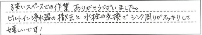 狭いスペースでの作業ありがとうございました。ビルトイン浄水器の撤去と水洗の交換でシンク周りがスッキリして嬉しいです!