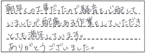 朝早くの工事だったので、騒音を心配していましたが、配慮ある作業をして頂きとても満足しています。ありがとうございました。