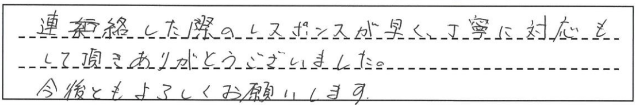 連絡した際のレスポンスが早く、丁寧に対応もして頂きありがとうございました。今度ともよろしくお願いします。