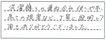 洗濯機との兼ね合や使いやすい高さの提案など、説明して頂きありがとうございました。