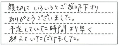 親切にいろいろとご説明下さりありがとうございました。予定していた時間より早く終えていただけました。