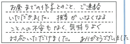 お昼までの作業とのこと、ご連絡いただきました。担当がいなくなることへの不安もなく、気持ちよく対応いただけました。ありがとうございました。