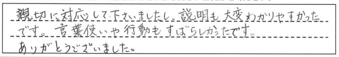 親切に対応して下さいましたし、説明も大変わかりやすかったです。言葉使いや行動もすばらしかったです。ありがとうございました。