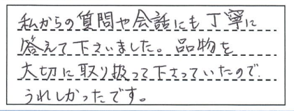私からの質問や会話にも丁寧に答えて下さいました。品物を大切に取り扱って下さっていたのでうれしかったです。