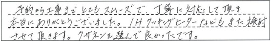 予約から工事までとてもスムーズで丁寧に対処して頂き本当にありがとうございました。IHクッキングヒーターなどもまた検討させて頂きます。クサネンを選んでよかったです。