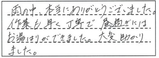 雨の中、本当にありがとうございました。作業も早く、丁寧で昼過ぎにはお湯張りができました。大変助かりました。