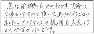 急な雨降りにもかかわらず、丁寧に工事をすすめて頂いてありがとうございました。メンテナンスの説明も大変分かりやすかったです。