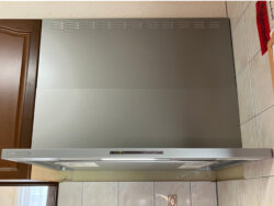 そこで規定の位置までレンジフードを上げるとタイルが貼られていない部分が露出してしまいました。当日は部材を用意できていなかったため後日再度お伺いし、鋼板を貼らせていただきました。