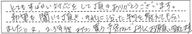 とてもすばやい対応をして頂きありがとうございます。希望も聞いて頂き、それに沿ったものを教えてもらいました。又、2.3年後エアコンを買う予定なんでよろしくお願い致します。