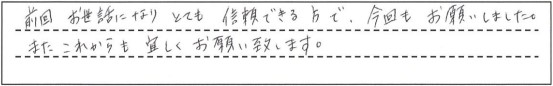 前回お世話になりとても信頼できる方で、今回もお願いしました。また、これからも宜しくお願い致します。