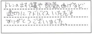 ドレンの出す位置や配管の曲げなど適切にアドバイス頂きありがとうございました。