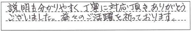 説明も分かりやすく丁寧に対応頂きありがとうございました。益々のご活躍を祈っております。
