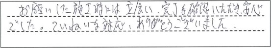 お願いした施工時には立ち会い、完了も確認頂き安心でした。丁寧な対応ありがとうございました。