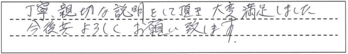 丁寧、親切な説明をして頂き大変満足しました。今後もよろしくお願い致します。