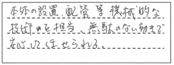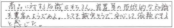 商品に対する知識はもちろん、設置等の技術的な知識も豊富のようである。とても誠実そうで安心して依頼できると感じた。