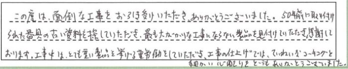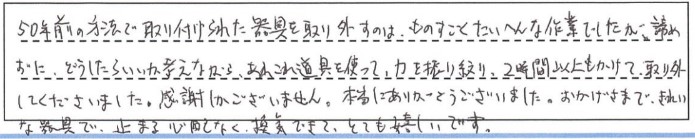 この度は面倒な工事をお引き受けいただきありがとうございました。50年前に取り付けられた器具の古い資料を探していただき、最も大がかりな工事にならない製品を見つけていただき感謝しております。工事中はとても重い製品をあげる重労働をしていただき、工事の仕上げでは丁寧なコーキングと細かい心配りをどうもありがとうございました。