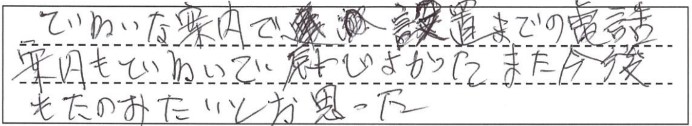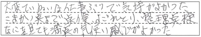 大変ていねいな仕事ぶりで気持ちがよかった。こまかい点まで点検、よごれとり、整理点検なにを見ても満点の気遣い感じがよかった。