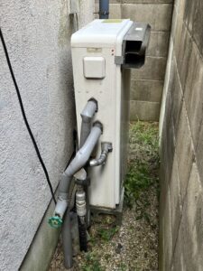25年も働いてくれたのはノーリツの給湯器、今では主流でない「浴室隣接タイプ」という2つ穴タイプで、給湯器と浴槽を直接つないでいました。