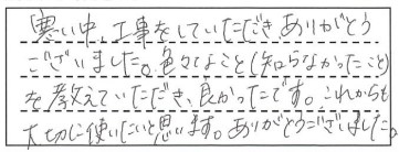「以前はメンテナンス方法を聞いていなかったので、詳しい説明をありがとうございます。」と仰っていただきました。