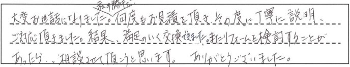 大変お世話になりました。私の勝手で何度もお見積を頂き、その度に丁寧に説明ご対応頂きました。結果、満足のいく交換できました。また、リフォームを検討することがあったら、相談させて頂こうと思います。ありがとうございました。