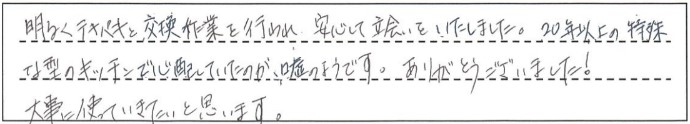 明るくテキパキと交換作業を行われ、安心して立ち会いを致しました。20年以上の特殊な型のキッチンで心配していたのが嘘のようです。ありがとうございました!大事に使っていきたいと思います。