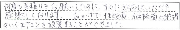 何度も見積もりをお願いしたのにすぐに対応して頂いて感謝しております。おかげで性能面、価格面で納得のいくエアコンを設置することができました。