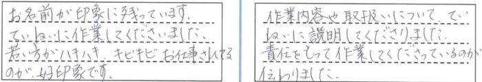 お名前が印象に残っています。ていねいに作業して下さいました。若い方がハキハキ、キビキビお仕事されてるのが好印象です。