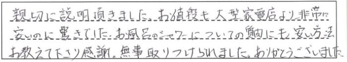 親切に説明して頂きました。お値段も大型家電店より非常に安いのに驚きでした。お風呂のシャワーについての質問にも安い方法を教えて下さり感謝。無事取りつけられました。ありがとうございました。