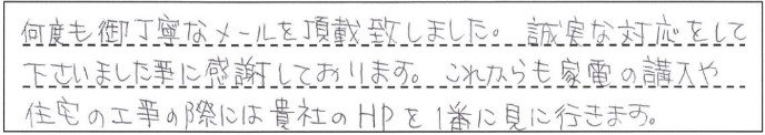 何度も御丁寧なメールを頂戴致しました。誠実な対応をして下さいました事に感謝しております。これからも家電の購入や住宅の工事の際には貴社のHPを1番に見に行きます。